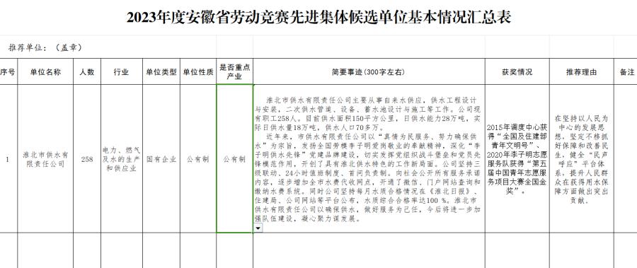 根據(jù)省總工會(huì)《關(guān)于推薦評(píng)選 2023 年度安徽省勞動(dòng)競賽先進(jìn)集體、先進(jìn)個(gè)人和省五一勞動(dòng)獎(jiǎng)、省工人先鋒號(hào)的通知》(皖競字〔2024〕1 號(hào))文件精神,現(xiàn)對(duì)申報(bào)單位供水公司予以公示。